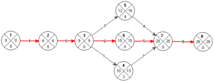 Критический путь – 1,2,3,6,7,8 = 28 суток - максимальный по продолжительности полный путь.