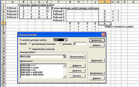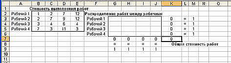 Пусть переменная xij= 1, если i-м рабочим выполняется j-я работа, и хij= 0, если i-м рабочим не выполняется j-я работа. Тогда модель имеет следующий вид: