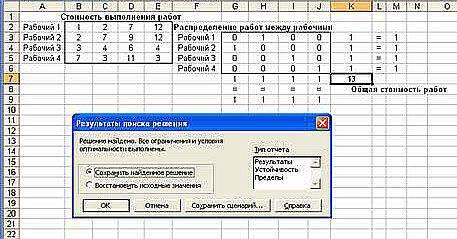 В этой таблице строки соответствуют рабочим, а столбцы — работам. Необходимо составить план выполнения работ так, чтобы все работы были выполнены, каждый рабочий был загружен только на одной работе, а суммарная стоимость выполнения всех работ была минимальной. Отметим, что данная задача является сбалансированной, т. е. число работ совпадает с числом рабочих. Если задача не сбалансирована, то перед началом решения ее необходимо сбалансировать, введя недостающее число фиктивных строчек или столбцов с достаточно большими штрафными стоимостями работ.