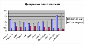 Для расчета оценок эластичности по месяцам года умножим значения соответствующих ресурсоемкостей на значения предельной электроемкости для каждой однофакторной модели. Как следует из диаграммы, эластичность наибольшая в феврале и наименьшая в апреле, что соответствует наименьшему и наибольшему выпуску продукции. Следовательно, управлять расходом электроэнергии целесообразно при меньших объемах выпускаемой продукции.