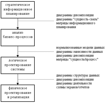 Этап стратегического информационного планирования начинается с построения стратегического плана для бизнес-системы, включающего цели и стратегии их достижения. Далее строится модель предметной области, отражающая существующую специфику и определяющая основные бизнес-процессы и организационную структуру бизнес-системы, а также определяется порядок разработки информационной системы. При моделировании используются диаграммы декомпозиции (иерархические древовидные структурные диаграммы) и диаграммы "сущность-связь" для представления основных бизнес-процессов и структур данных, соответственно.
