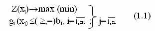 1) Набір керованих змінних x1, x2, ... x n, значення яких підлягають оптимізації. Різні допустимі комбінації значень змінних відповідають можливим розв’язкам задачі. 2) Цільова функція z (x1, x2, ... x n) - функція, що виражає залежність прийнятого критерію оптимальності від керованих змінних. Критерій оптимальності є мірою наближення розв’язку до поставленої мети. В економічних задачах, як правило, таким критерієм виступає показник ефективності функціонування системи (наприклад, прибуток від реалізації продукції, продуктивність праці, таке інше) або показник витрат. 3) Умови або обмеження g (x1, x2, ... x n), що накладаються на значення змінних або на співвідношення між ними. Зауважимо, що задача лінійного програмування спрямована на пошук найбільш вигідного способу розподілу обмежених ресурсів за декількома видами виробничої діяльності. У такій задачі представлено n видів виробничої діяльності, інтенсивності використання котрих (шукані величини) скаладають x1, x2, … xn . Для здійснення усіх видів виробничої діяльності є в наявності m видів ресурсів, можливі обсяги споживання яких обмежені значеннями b1, b2, …, bm. Витрати і-го ресурсу на одиницю продукції j-го виду виробництва дорівнюють aij. Тому сума