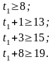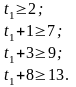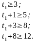 Третье неравенство выражает требование, чтобы третья стадия работ на втором объекте начиналась лишь после окончания третьей стадии работ на первом объекте, т.е. через восемь месяцев (первая и вторая стадии работ на втором объекте уже выполнены, следовательно, t2 +5).