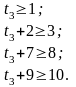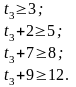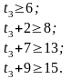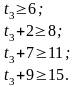 Зная сроки окончания стадии работ на втором объекте, аналогично определяем срок t3 начала строительства третьего объекта (A3). Для него неравенства будут следующие:
