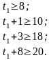 Четвертое неравенство выражает требование, чтобы четвертая стадия работ на втором объекте начиналась лишь после окончания четвертой стадии работ на первом объекте, т.е. через десять месяцев (первая, вторая и третья стадии работ на втором объекте выполнены, следовательно, t2 + 8).
