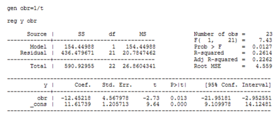 Как видно из этих данных, коэффициент детерминации у регрессии для гиперболической функции значительно хуже, чем у других моделей. А константа и коэффициент при переменной