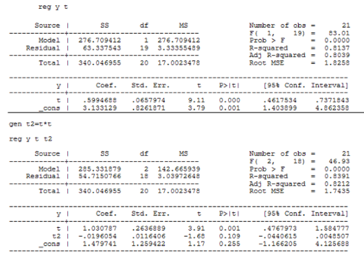 Выберем модель параболической регрессии на основании лучших коэффициента детерминации и скорректированного коэффициента детерминации у этой модели. Получим следующую модель:
