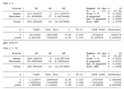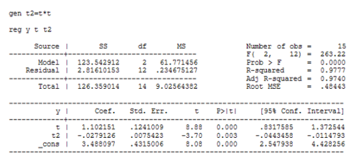 Выберем модель параболической регрессии на основании лучших R-квадрата и скорректированного R-квадрата у этой модели. Получим следующую модель: