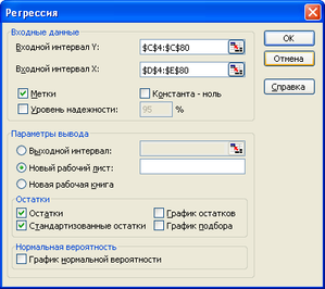 Для построения уравнения регрессии скопируем на чистый рабочий лист значения используемых переменных (прил. 5) и проведем регрессионный анализ (рис. 3). Его результаты приведены в прил. 6 и перенесены в табл. 3. Уравнение регрессии имеет вид: