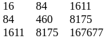 ХТХ = 16*460*167667+1611*84*8175+1611*84*8175-1611*460*1611-84*84*167677-16*8175*8175 = 1234102720+1106273700+1106273700-1193847660-1183128912-1069290000 = 383548