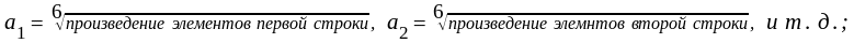а) рассчитывается среднее геометрическое элементов в каждой строке матрицы по формуле: