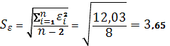 Для построения интервального прогноза рассчитаем доверительный интервал. Критерий Стьюдента (при v=n -2=10–2=8) равен 1,8595. Ширину доверительного интервала вычислим по формуле: