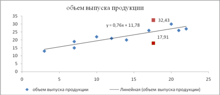 7. Графическое представление (рис. 3) модели парной регрессии зависимости объема выпуска продукции от объема капиталовложений: фактические и модельные значения