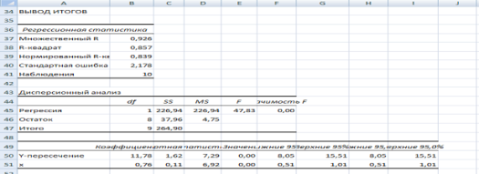 Значение F – критерия Фишера можно найти в таблице протокола Excel (рис. 2), Fрасч=47,83. Табличное значение F – критерия при доверительной вероятности 0,05 равно 4,46, т. к. Fрасч>Fтабл, уравнение регрессии следует признать адекватным.