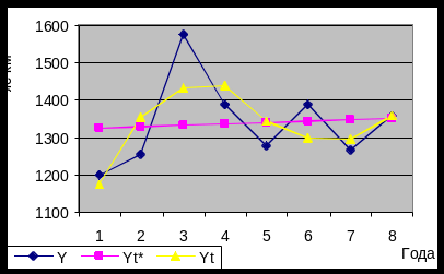 | Год | t | y | t² | ty | t4 | t6 | t²y | t³y | Yti* | Yt | (Yti*-y)² | (Yt-y)² |