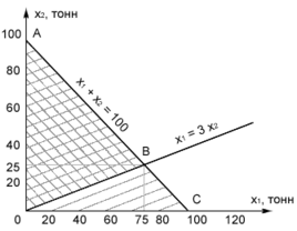 Внаслідок позитивних значень x1 і x2 (x1 ≥ 0; x2 ≥ 0) роз’вязання варто шукати в першому квадранті. Обмеження за сумарним випуском (x1 + x2 ≤ 100) звужує область пошуку до трикутника ОАС, який знаходиться всередині обмеженого зверху прямою x1 + x2 = 100. Обмеження x1 ≤ 3 x2 ще більш звужує область припустимих за умовою задачі значень x1 і x2, укладаючи її в трикутник ОАВ, обмежений знизу прямою x1 ≤ 3 x2. Серед усіх значень x1 і x2, ув'язнених всередині ОАВ, оптимальним відповідає тока В. У цій точці, що відповідає координатам x1 = 75; x2 = 25, досягається найбільше з припустимих значень x1, рівне 75. До найбільшого ж значення x1 і треба прагнути, тому що перший вид продукції дає у розрахунку на одну тонну більше прибутку, ніж другий (12 > 8), тобто треба вибирати найбільше з можливих, припустимих значень x1. Оптимальному роз’вязанню відповідає, таким чином, точка B, у якій цільова функція досягає свого максимального значення