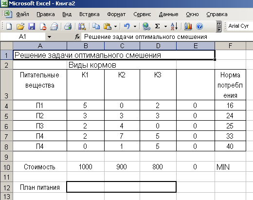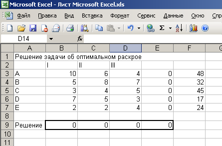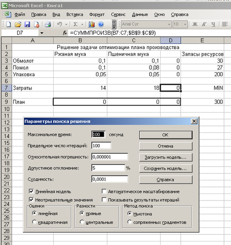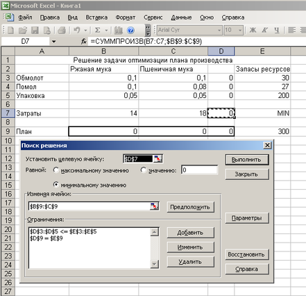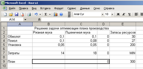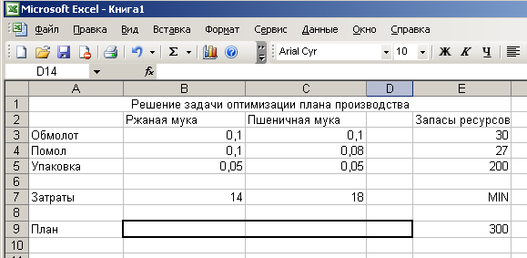 Добавим в таблицу еще одну строку (например, строку 9 План), в которую будут вноситься получаемые в ходе решения результаты. Объем производства ржаной муки будем предполагать получить в ячейке В9, пшеничной муки - в ячейке С9, а затраты на себестоимость - в ячейке D7.