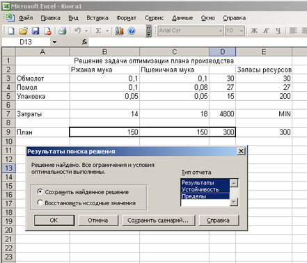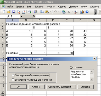 Запуск процесса оптимизации производится нажатием кнопки Выполнить. По окончании счета появляется диалоговое окно Результаты поиска решения. Нажав в нем соответствующую кнопку, можно сохранить найденное решение или восстановить исходные значения. Изменения при этом коснутся как целевой ячейки, так и влияющих ячеек. В этом же диалоговом окне можно указать необходимые типы отчетов, которые будут размещены на отдельных листах книги.