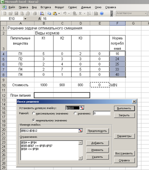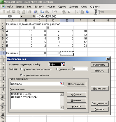 Введем в таблицу формулы для расчета левых частей ограничений и целевой ячейки: