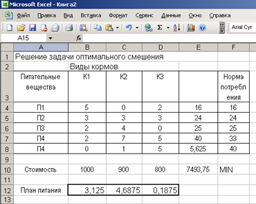 В ходе расчетов получим следующие результаты: оптимальный рацион должен содержать 3,125 ед. корма К1, 4,6875 ед. корма К2 и 0,1875 корма К3. При этом стоимость рациона будет составлять 7493,75 руб.