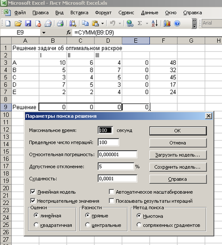 Подготовим таблицу в Microsoft Excel, содержащую исходные данные задачи, введем формулы для расчета целевой функции и левой части ограничений, заполним форму модуля Поиск решения: