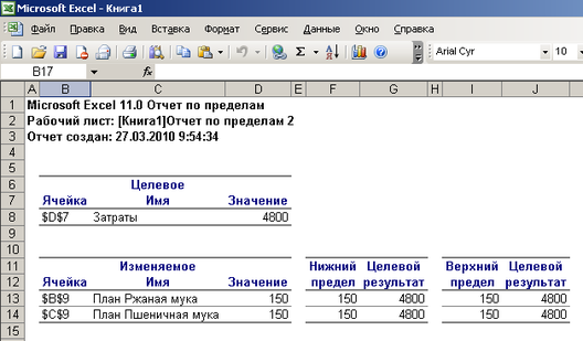 Отчет Результаты отражает исходные и результирующие значения целевой и влияющих ячеек, а также сведения о наложенных ограничениях.