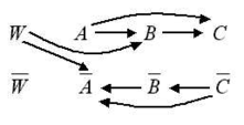 Проверка по теореме показывает, что корректность структуры не нарушится. Но в чем заключается "условность" данного экзистенциального суждения? Точнее, при каких условиях или корректных изменениях в структуре добавление этого суждения в структуру приведет к коллизии? Дело в том, что в структуре содержится соотношение AB (т.е. в терминах алгебры множеств AB – нестрогое включение), и при этом допускается возможность равенства A и B. В то же время экзистенциальное суждение W(