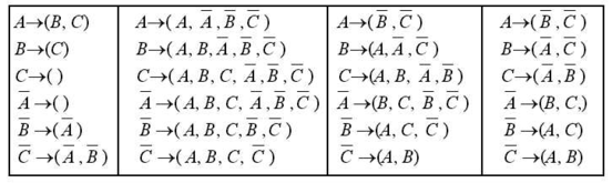 В первой колонке записывается CT-замыкание нашей системы – слева от стрелки литерал, а справа – литералы, которые достижимы из этого литерала. Сразу же в этой колонке видны максимальные элементы нашей структуры – у них скобки справа пустые. Зная максимальные элементы, можно легко получить минимальные элементы E-структуры (они необходимы для построения максимальных верхних конусов). Оказывается, минимальные элементы в E-структурах являются дополнениями максимальных элементов (имеется доказательство этого соотношения, которое здесь не приводится). Так, в нашем примере минимальные элементы A и