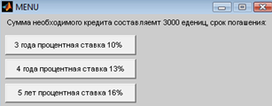 e=menu('Сумма необходимого кредита составляет 3000 единиц, срок погашения: ','3 года процентная ставка 10% ','4 года процентная ставка 13%','5 лет процентная ставка 16%')