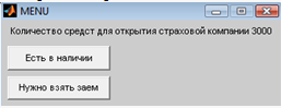 q= menu('Количество средст для открытия страховой компании 3000 ','Есть в наличии','Нужно взять заем')