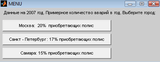 k = menu('Данные на 2007 год. Примерное количество аварий в год. Выберите город: ','Москва: 20% приобретающих полис ',' Санкт - Петербург : 17% приобретающих полис ','Самара: 15% приобретающих полис')