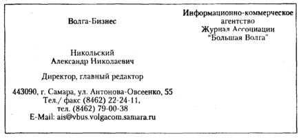 Деловые люди сегодня при знакомстве часто обмениваются визитными карточками. Это удобно. Это экономит время, потому что визитная карточка содержит необходимую информацию о деловом человеке: его имя, отчество, фамилию, должность, место работы, контактные телефоны, часто и домашний телефон и адрес. Поэтому в случае, если вы вручаете визитную карточку, необязательно называть имя и отчество, можно только фамилию. Другое дело, если вы представляетесь, не имея при себе визитной карточки. Тогда вы называете полностью имя, отчество, фамилию и контактный телефон после названия или представления своей фирмы: