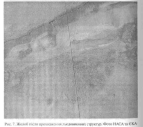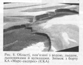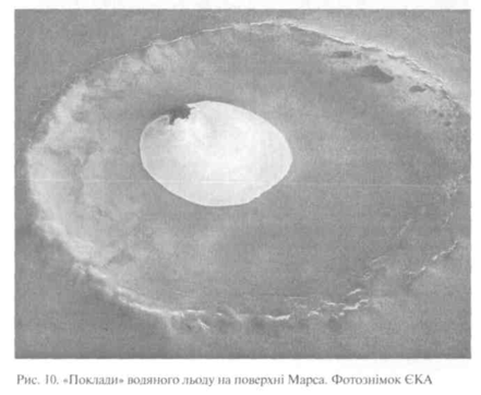 Здавалося, що дослідники вже практично впевнилися - вода з Марса або зовсім випарувалася, або пішла під землю, і, можливо, відбулося це мільйони років тому, а може, й мільярди. Та після липня 2005 р. вченим знову довелося переглянути свої висновки. Саме тоді фахівці з ЄКА повідомили, що на Марсі виявлено замерзлу воду на відкритій поверхні планети (рис. 6). На фотознімку, зробленому з борту КА «Марс-експрес», у високих північних широтах планети був зареєстрований кратер з покладами льоду на дні. Температура й тиск у тому районі такі, що там не може бути твердого двоокису вуглецю - так званого сухого люду.