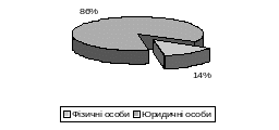 За даними (рис.3.1) видно, що кредити які надають комерційні банки фізичним особам складають 14% від загального об`єму наданих кредитів, тобто найбільша частка кредитів надається юридичним особам у розмірі 86%. Звідси випливає що кредит сприяє розвитку невеликих підприємств, тим самим він здійснює вплив на формування ринкової економіки України на засадах приватної власності та конкурентності на ринку товарів та послуг.