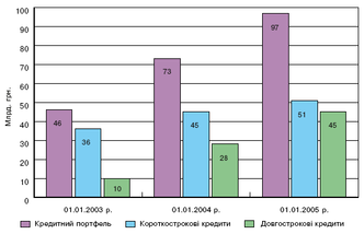Основною частиною активів банків (68.7%) є кредитний портфель. За 2004 рік він збільшився на 32.3% (за 2003 р. — на 57.1%) i на 01.01.2005 р . становив 97.2 млрд. грн. (45% коштів — у іноземній валюті). Збільшення відбулося в основному за рахунок зростання обсягів кредитів, наданих суб'єктам господарювання, (на 14.9 млрд. грн., або на 25.7%); кредитів, наданих фізичним особам (на 5.7 млрд. грн., або на 64.4%); кредитів, наданих іншим банкам та строкових депозитів, розміщених у інших банка; та в НБУ (на 3.2 млрд. грн., або на 48.1%).