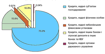 За станом на 01.01.2005 р . кредитний портфель мав таку структуру (див. рис. 3.4): кредити, надані суб'єктам господарювання, становили 75.0% (на 01.01.2004 р.-78.9%), кредити, надані фізичним особам, — 15.0% (12.1%), кредити, надані іншим банкам і строкові депозити, розміщені в інших банках та в НБУ, - 10.0% (8.9%), кредити, надані органам державного управління — 0.04% (0.1), кредити, надані небанківським фінансовим установам, -0.01%.
