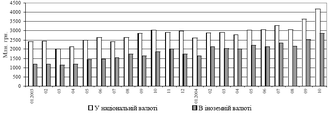 Із початку 2004 року ринок міжбанківських кредитів характеризувався суттєвим зростанням залишків заборгованості за кредитами, наданими іншим банкам. За січень -жовтень поточного року вимоги банків за зазначеними кредитами збільшилися на 49.8% (у тому числі за жовтень - на 14.8%) і на 01.11.2004 р. становили 7 млрд. грн. За видами валют спостерігалося прискорене зростання заборгованості за кредитами, наданими в іноземній валюті, порівняно із заборгованістю у національній валюті. Так, якщо вимоги банків за кредитами в іноземній валюті протягом 10 місяців 2004 року збільшилися на 64.5%, то за гривневими позичками зростання становило 41.2%. Однак у жовтні дещо вищими темпами зростали залишки заборгованості за кредитами в національній валюті - 115.3% (в іноземній - 113.9%) (див. рис. 3.6).