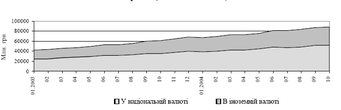 За 2004 рiк вимоги банків за кредитами, наданими в економіку України, збільшилися на 29.6%, у тому числі в національній валюті - на 29.9%, в іноземній -на 29.2%, і в цілому становили 87.9 млрд. грн. У жовтні поточного року порівняно з вереснем приріст залишків заборгованості за кредитами становив 0.9% виключно за рахунок зростання їх частини в іноземній валюті (на 3%). Вимоги банків за кредитами, наданими суб'єктам господарювання та фізичним особам у національній валюті, за жовтень 2004 року скоротилися на 0.5%.