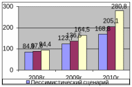 Пессимистичный вариант предполагает, что государство примет пассивную стратегию поддержки сегмента, фактически сохранив status quo в области стимулирования малых предприятий. В этом случае ограничения, связанные с развитием рынка, будут сниматься по мере его естественного «созревания». Банки найдут способ решить проблему с залогами, наработают опыт, конкуренция будет стимулировать снижение процентных ставок, а сами малые предприятия перестанут относиться к кредитованию как к финансовой экзотике. Согласно этому сценарию темпы роста портфелей будут постепенно замедляться. В этом случае к 2010 г. накопленный объем кредитов МСБ составит, по нашим прогнозам, порядка 168 млрд долл.