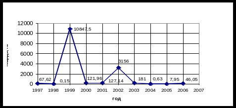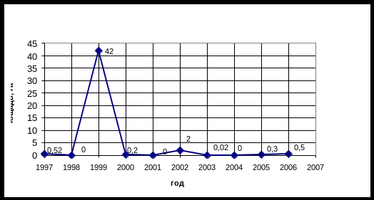 Рис. 2.3 – Динамика сгоревшей площади торфяных болот на территории Вологодской области в 1997-2006 гг.