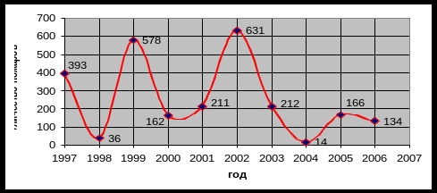 Рис. 2.9 – Динамика количества лесных и торфяных пожаров на территории Харовского района в 1997-2006 гг.