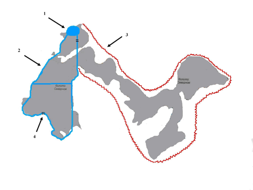 На рис. 4.2 показано возможное расположение противопожарных барьеров: противопожарный водоем, противопожарные канавы, минерализованная полоса; а также переезды через противопожарные канавы. Данные инженерные сооружения позволяют защитить торфяное болото от пожара наступающего из леса, а также остановить, распространяющийся огонь, на самом огнеопасном участке болота.