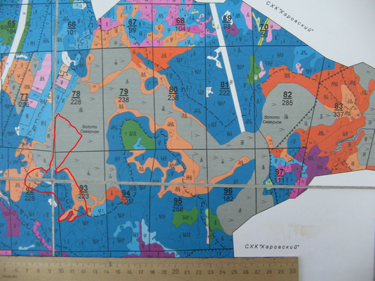 В виде примера по разработке противопожарных мероприятий рассмотрим болото Северное, находящиеся в 5 км к югу от города Харовск. Общая площадь 2203 Га, болото сфагновое, средняя мощность торфа 1.5 метра, состав болота неоднородный. Летом 1999 года болото горело, пожар был обнаружен 01.08. в 17:20 в 93 квартале Харовского лесничества. Площадь пожара в момент обнаружения составляла 5 Га. Тушение началось 02.08.99 в 8:00, пожар ликвидирован 20.08.99 в 21:00. Очаг возгорания образовался в лесу на прилегающем к болоту суходоле, в результате неосторожного обращения с огнем. Пожар распространялся из 93 кв, в 92 кв в направлении болота Северное, спровоцировав возгорание торфа. На территории болота пожар распространялся в северном направлении из кварталов 93, 92 в квартал 78. Первоначально пожар был низовой, в дальнейшем - переходящий в торфяной подземный. В 93 кв выгорело 54 га леса, в 92 кв – 79га, состав леса – берёза-спелая, сосна. Площадь выгоревшего болота 41Га (рис. 4.1). Серым цветом показано болото Северное, красной линией показана выгоревшая площадь.