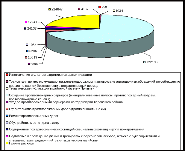 Совершенствование противопожарной пропаганды требует намного меньших затрат. На тематические публикации в районной газете и обустройство мест отдыха в лесу на пожароопасный сезон должно быть направлено по 1034 руб., а на изготовление и установку противопожарных плакатов потребуется 750 руб.
