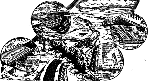 Временное восстановление затопленных и размытых дорог так же, как и капитальное восстановление, начиналось с устранения причин, вызвавших затопление (заделка брешей в плотине с использованием подручных материалов).