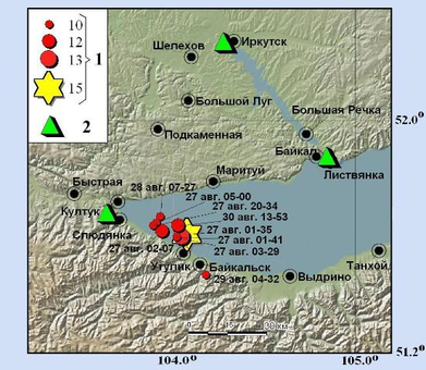 Рано утром 27 августа в южной части Байкала произошло землетрясение, мощность которого составила около 10 баллов. В Иркутске были зафиксированы сейсмические толчки интенсивностью 6 - 7 баллов, в Байкальске - 8, а в Ангарске и Черемхове - до 5 баллов. Землетрясение ощущалось также во многих регионах Сибири: от Красноярска и Новосибирска до Читы. В этих городах магнитуда составила от 2 до 2,5. Представители ГУ МЧС по Иркутской области сообщают, что жертв и разрушений нет [рис. 1].