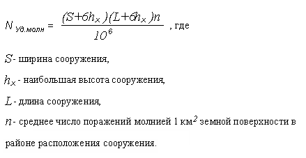 В связи со случаями поражения резервуаров молнией при наличии нормативной молниезащиты, представляет интерес вопрос о степени надёжности молниезащиты для резервуаров различного объёма. Ожидаемое число поражений от ударов молний в год на сооружение, необорудованное молниезащиты, определяют по формуле: