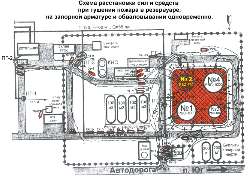 | Дополнительно прибывающим силам | 1. От АЦ 3-ПЧ, установленной с восточной стороны резервуарного парка подать 2 ствола РС-70 на защиту л/с с южной я восточной стороны. 2. От АЦ 25-ПЧ, установленной с западной стороны резервуарного парка подать ствол РС-70 на защиту л/с с западной стороны. 3. От АЦ 5-ПЧ, установленной с северной стороны резервуарного парка подать ствол РС-70 на защиту л/с с северной стороны. 4. От РТ-80 4-ПЧ (южная сторона) подать ствол ГПС-600 на тушение пожара в обваловании с южной стороны. 5. От АЦ 28-ПЧ, установленной на ПГ-2 проложить резервную магистральную линию d=77 мм к резервуарному парку. | ||||
