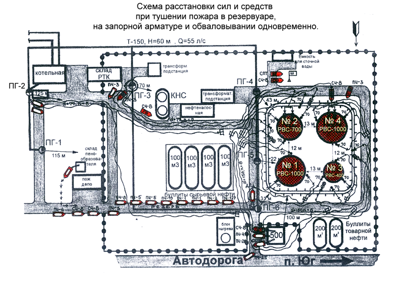 | Дополнительно прибывающим силам | 1. От РТ-80 4-ПЧ (северная сторона) подать ствол РС-70 на защиту л/с с восточной стороны. 2. От РТ-80 4-ПЧ, установленного у РВС №3 подать ствол "Л" на защиту л/с с западной стороны. 3. От РТ-80 28-ПЧ (западная сторона) подать ствол ГПС-600 в обвалование с западной стороны. 4. От АЦ 112-ПЧ, установленной на ПГ-2, проложить 2 резервные магистральные линии d=77 мм к резервуарному парку. | |||