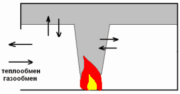 Поступление холодного воздуха обусловлено работой проталкивания, которую совершает внешняя среда. Термогазодинамическая система в свою очередь совершает работу, выталкивая нагретые газы во внешнюю атмосферу. Эта термодинамическая система взаимодействует также с ограждающими конструкциями путем теплообмена. Кроме того, в эту систему с поверхности горящего материала (т.е. из пламенной зоны) поступает вещество в виде газообразных продуктов горения.